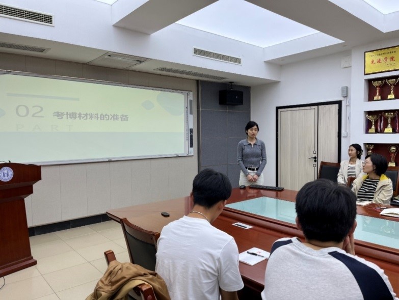 毛艺霖主要围绕学习科研经验、日常时间安排、如何提高效率等方面进行交流。她勉励支部党员作为一名研究生党员,要认真学习政治理论知识,时刻保持思想的先进性;要勤奋学习,踏实科研;积极参加学生工作,锻炼各方面能力全面发展。庄婕针对有升学意向的学生党员,详细介绍了博士招生的不同考核形式,并建议大家一要根据自己的能力选择目标学校,避免盲目考博;二要尽早着手准备材料,丰富自己的知识储备;三要加强英语、专业知识的学习,强化实验技能。最后庄婕鼓励大家不要害怕失败,也不要轻言放弃,做好研究生期间的学业规划。