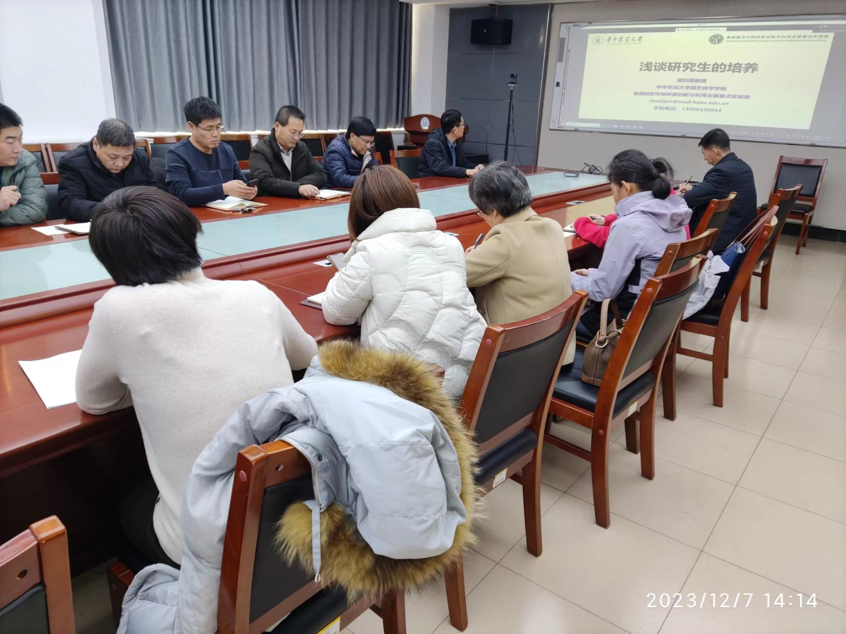 柴利军教授围绕着研究生培养的18字经验“立规矩、明方向;正风气、塑文化;树典型、共发展”,为学院导师们分享了华中农业大学柑橘种质资源团队在研究生培养方面的具体做法。他在交流中强调,作为研究生导师,在学术研究和人才培养中要实事求是,规范诚信,做好新生和新老师的入门培训,注重实践,学以致用;要注重团队学术氛围及文化养成,加强对外科普与宣传,打造实验室文化,提升实验室凝聚力和影响力;要注重研究生教育中的个性化培养,因材施教,包容学生的创新性想法。特别强调了导师要在培养研究生过程中发挥积极作用,要加强对课题大方向的指导及把控;在学生研究的具体细节上给予充分的自主权;鼓励学生对新技术、新方法的应用。