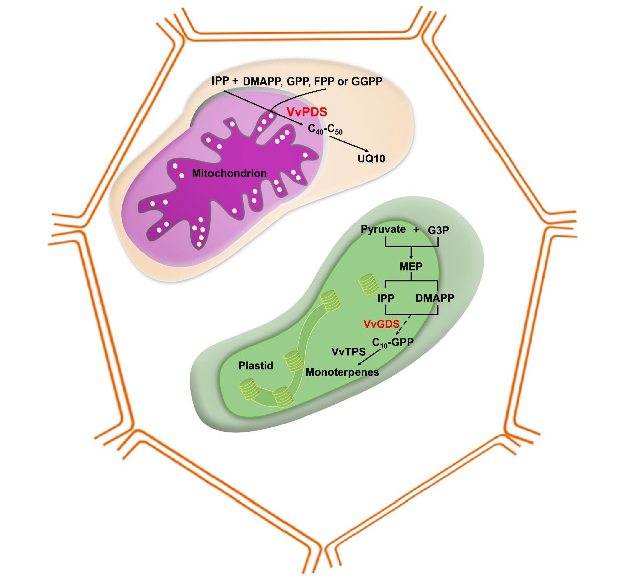 图2 葡萄VvPDS定位线粒体,编码长链异戊烯基焦磷酸合酶,参与泛醌(UQ10)生物合成工作模型。