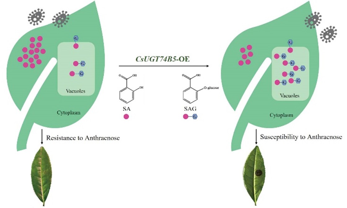 综上所述,CsUGT74B5在茶树体内可催化SA的糖基化形成SAG,减少叶片中游离态SA含量,影响了茶树对炭疽病的抗性。本研究将为开发高效生物抑菌剂和茶园绿色防控提供理论指导。