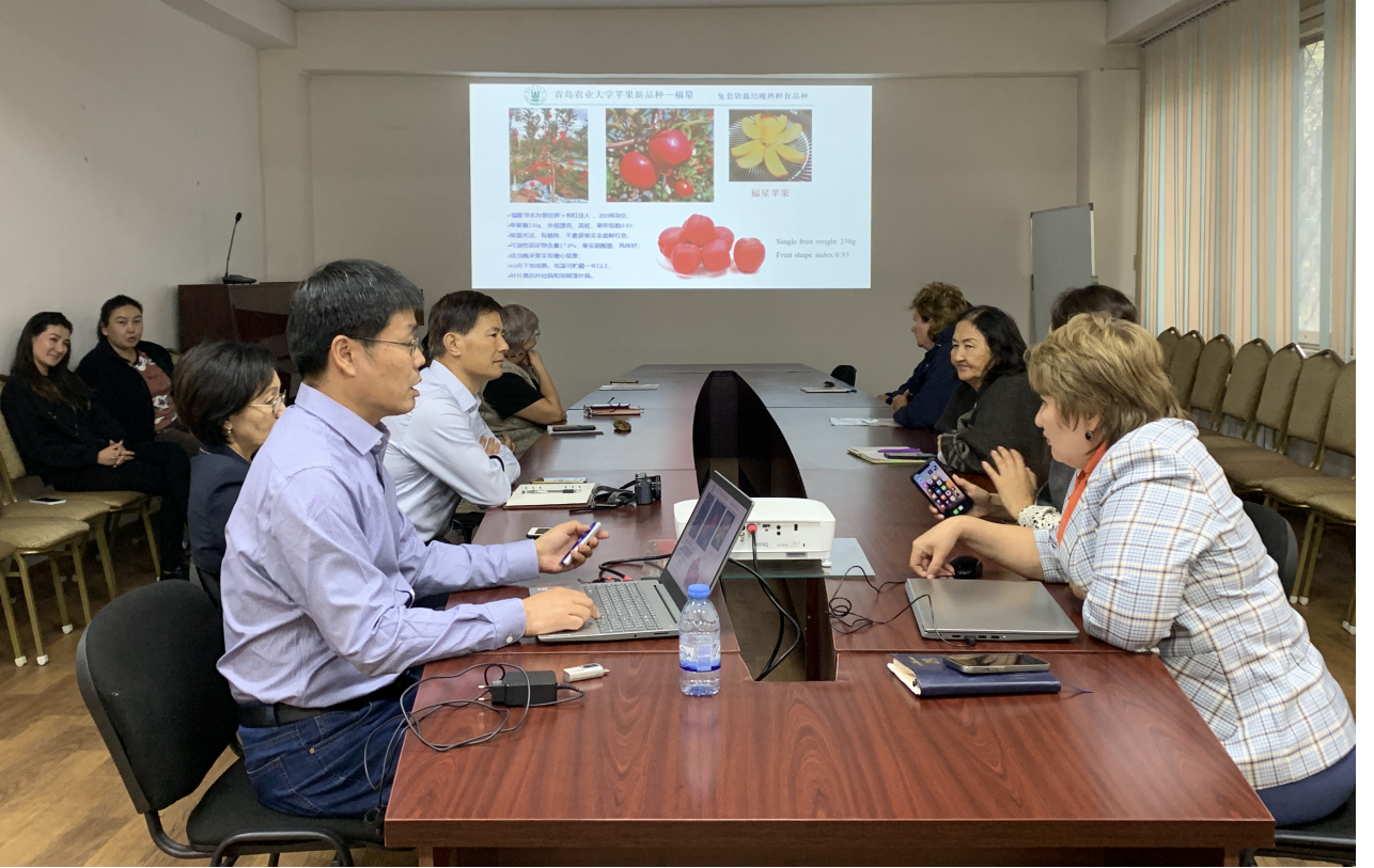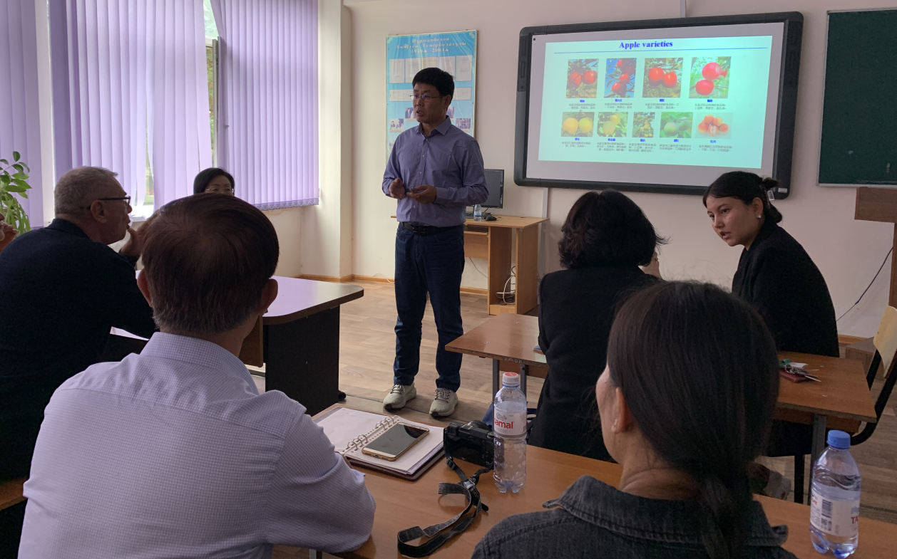 在访问哈萨克斯坦期间,会见了哈萨克斯坦国立农业大学农业生物学学院院长阿比尔达耶夫·叶尔詹(Abildayev Yerzhan)研究员、哈萨克斯坦农科院院士、哈萨克斯坦国立农业大学农业生物学学院园艺系凯罗娃·古尔沙利亚(Kairova Gulshariya)教授、园艺系主任、教研室主任、专业教师以及哈萨克斯坦农科院果蔬所所长、科研人员。围绕苹果野生资源评价与利用以及苹果抗病育种技术进行了交流,讨论了未来的国际合作。张玉刚教授作了“kaiyun登录中国入口登录苹果抗病杂交育种研究进展”的报告,并参观了该校与日本合作建立的生物技术研究中心实验室、学校实验站和苹果园。