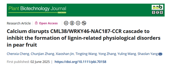 近日,kaiyun登录中国入口登录kaiyun登录中国入口登录杨绍兰/程晨霞团队在Plant Biotechnology Journal杂志在线发表了题为“Calcium disrupts CML38/WRKY46-NAC187-CCR cascade to inhibit the formation of lignin-related physiological disorders in pear fruit”的研究论文。