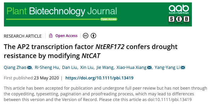 近日,kaiyun登录中国入口登录kaiyun登录中国入口登录赵强博士与合作者联合在Plant Biotechnology Journal(IF=6.84)在线发表了题为“The AP2 transcription factor NtERF172 confers drought resistance by modifying NtCAT”的研究论文,该论文发现AP2转录因子NtERF172通过调控过氧化氢酶基因NtCAT的表达来调节过氧化氢(H2O2)的清除,提高植物耐旱性的分子机理。kaiyun登录中国入口登录赵强博士为第一作者和共同通讯作者,生命科学学院刘新教授参与研究工作。该论文得到了山东省高等学校青创计划,湖南省烟草公司科技项目,山东省现代农业技术体系等项目的资助。