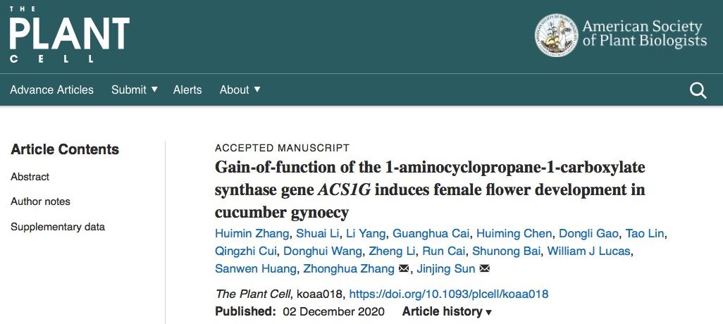 近日,kaiyun登录中国入口登录kaiyun登录中国入口登录张忠华教授和中国农业科学院蔬菜花卉研究所孙进京合作,联合中国农业科学院深圳农业基因组研究所首次发现黄瓜中全雌基因(Female)是获得新功能的基因ACS1G,并深入研究了其作用机制,提出了黄瓜雌花和雄花多样性发育的分子模型。相关研究内容『Gain-of-function of the 1-aminocyclopropane-1-carboxylate synthase gene ACS1G induces female flower development in cucumber gynoecy』于12月2日在线发表于《The Plant Cell》上。