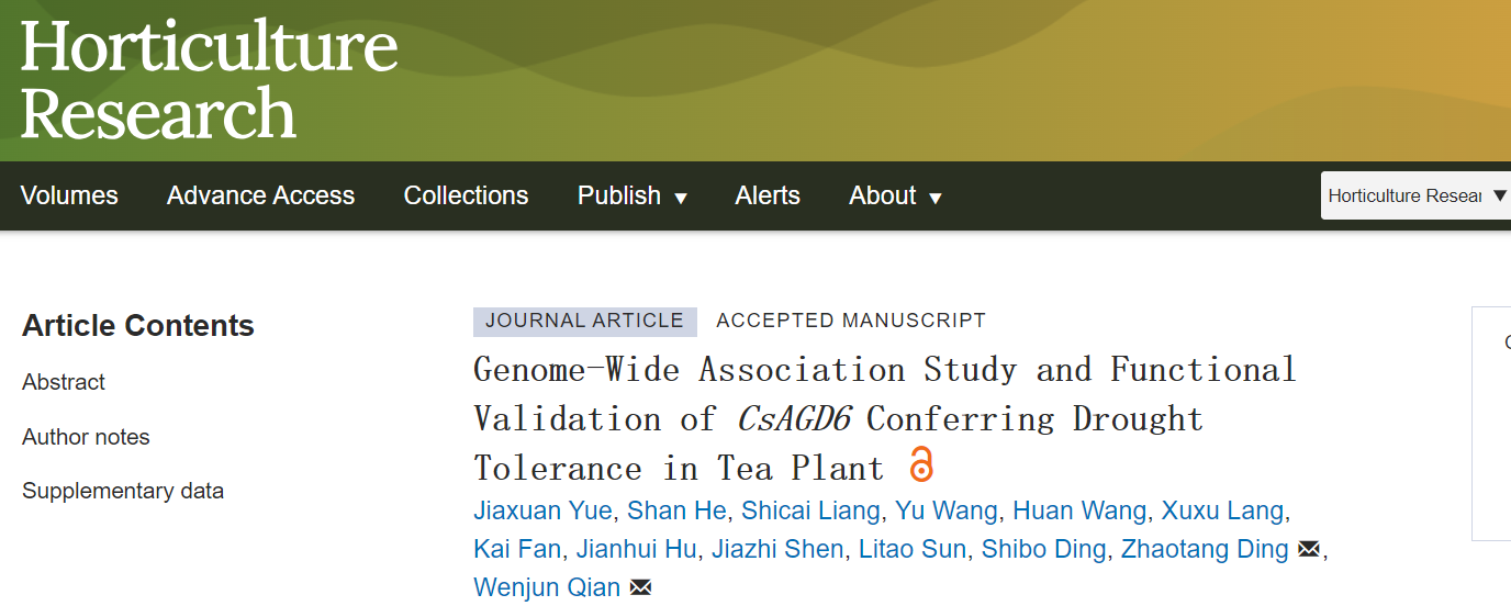近日,kaiyun登录中国入口登录茶树育种团队在《Horticulture Research》上发表了题为“Genome-Wide Association Study and Functional Validation of CsAGD6 Conferring Drought Tolerance in Tea Plant”的研究论文。该研究系统开展了茶树抗旱性的全基因组关联分析(GWAS),成功鉴定并功能验证了关键抗旱基因CsAGD6,发掘了其优良单倍型,并开发出可用于分子育种的KASP标记,为茶树抗旱机制解析与品种选育提供了理论依据和实用工具。
