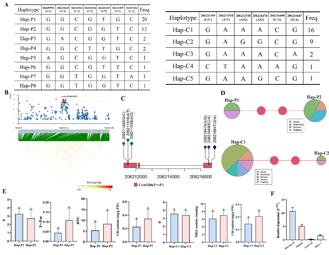进一步研究表明,CsAGD6编码一个定位于细胞核的ADP-核糖基化因子GTP酶激活蛋白。功能验证显示,沉默CsAGD6会导致丙二醛含量上升、叶绿素含量与Fv/Fm下降,加重氧化损伤并削弱光合能力;而过表达该基因则能增强膜稳定性与光合效率,有效提升抗旱性。单倍型分析发现,CsAGD6启动子区存在8种单倍型,编码区存在5种单倍型。其中Hap-P1和Hap-C1为优异单倍型,与茶树抗旱性显著相关。