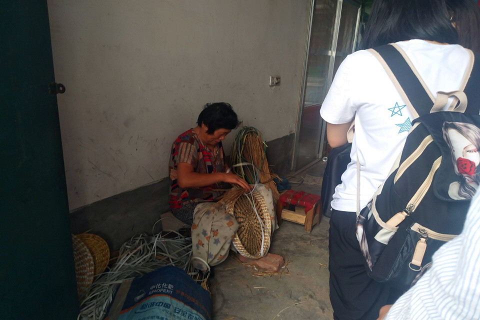 当队员们到达村子时,一名村民正在自家门前聚精会神地用麦秸编筐子。在草编锥的上下穿梭中,一根根麦秸在村民的手中摇身一变,一个筐子的雏形就形成了。一把麦秸快要用完了,就再续一把,听村民介绍,这叫“续草”。