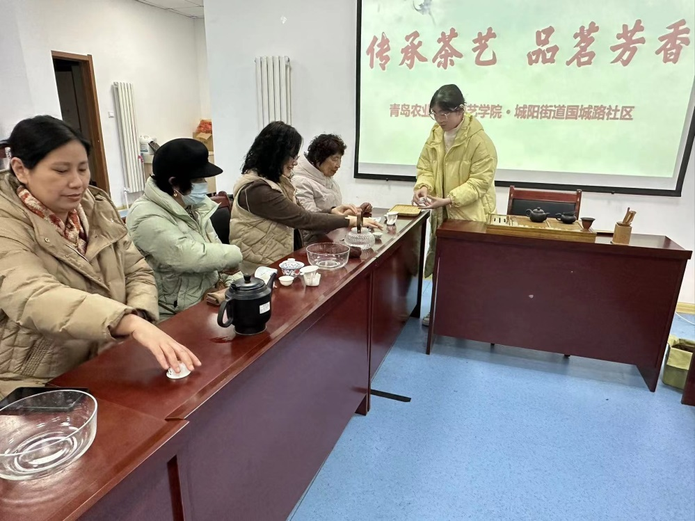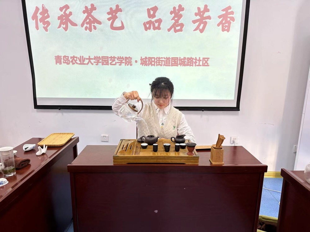 活动开始,志愿服务队的同学们为社区居民普及茶艺知识,带着大家了解茶的起源、饮茶文化、茶艺历史与发展等知识,对识茶、品茶、茶礼仪、茶与健康、茶与修养等茶文化知识进行了细致讲解。