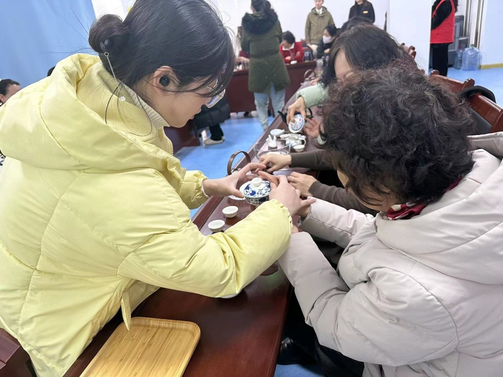 在实践环节中,由志愿服务队的同学们现场教学,一对一细心指导,社区工作人员及居民动手学习泡茶技巧和礼仪。