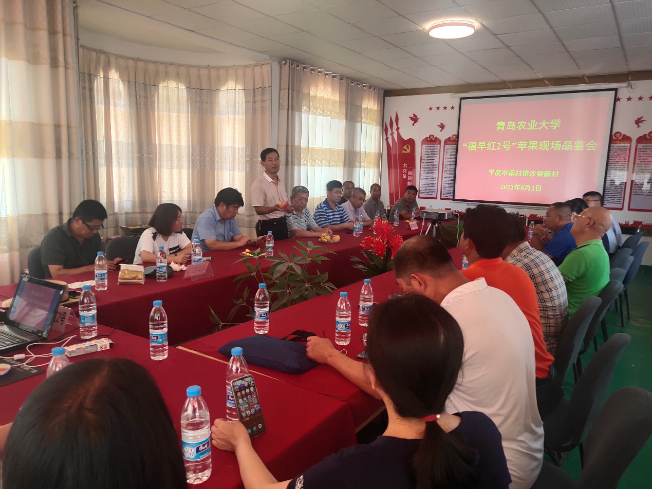 8月2日,kaiyun登录中国入口登录在学校苹果育种基地平度市南村镇沙梁新村召开早熟苹果新品种‘福早红2号’现场观摩品鉴会。国家苹果产业技术体系威海综合试验站站长曹洪建研究员和青岛综合试验站站长沙广利研究员、青岛农业技术推广中心刘安娜部长和郭江山研究员、平度市农业农村局赵克义站长、莱西市农业农村局刘明研究员、平度市南村镇相关领导、企业代表、苹果种植大户及合作社技术人员、kaiyun登录中国入口登录乡村振兴研究院张正明主任、kaiyun登录中国入口登录师生及苹果育种团队人员、当地果树技术人员共30余人参加本次观摩品鉴会。