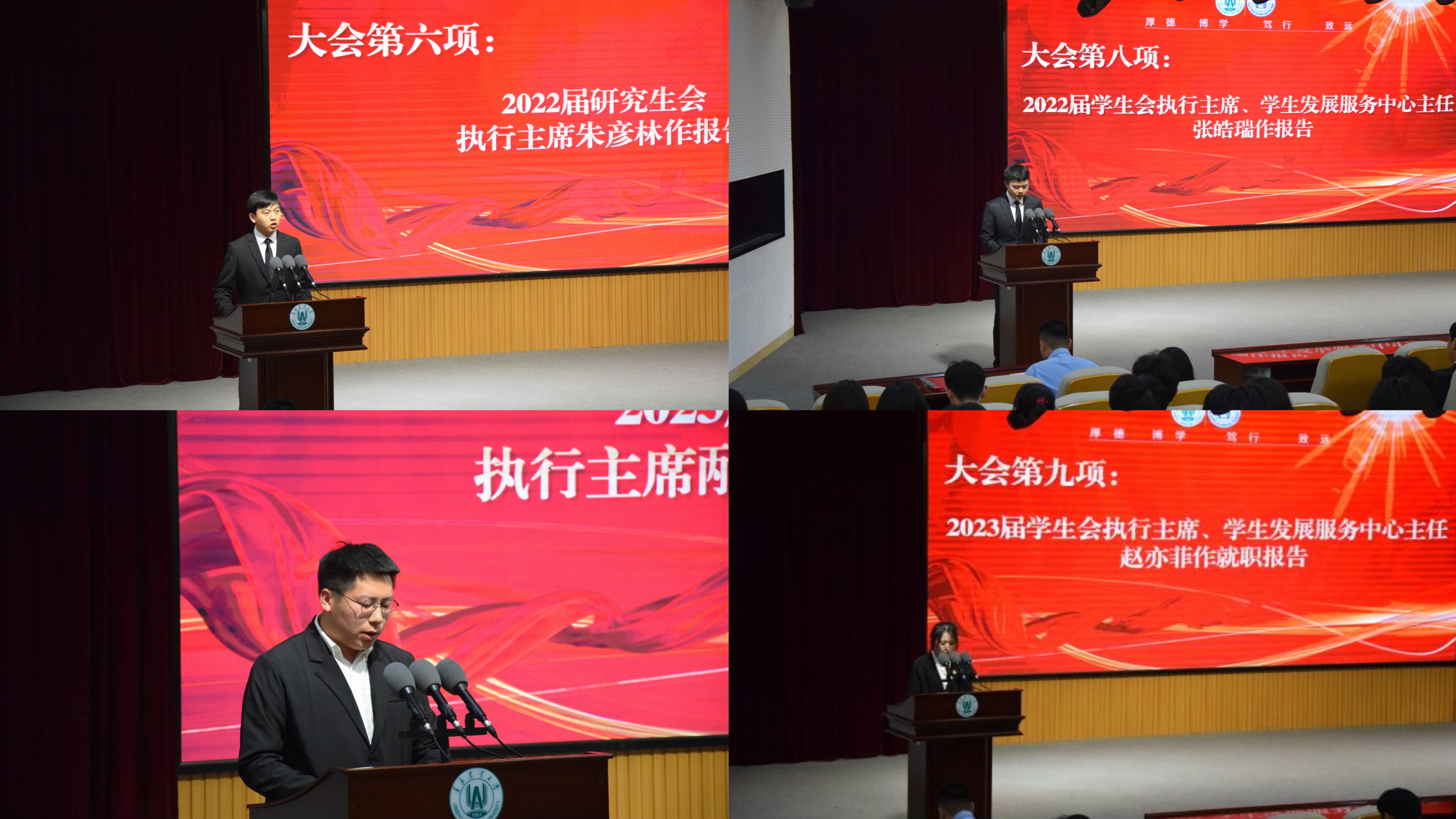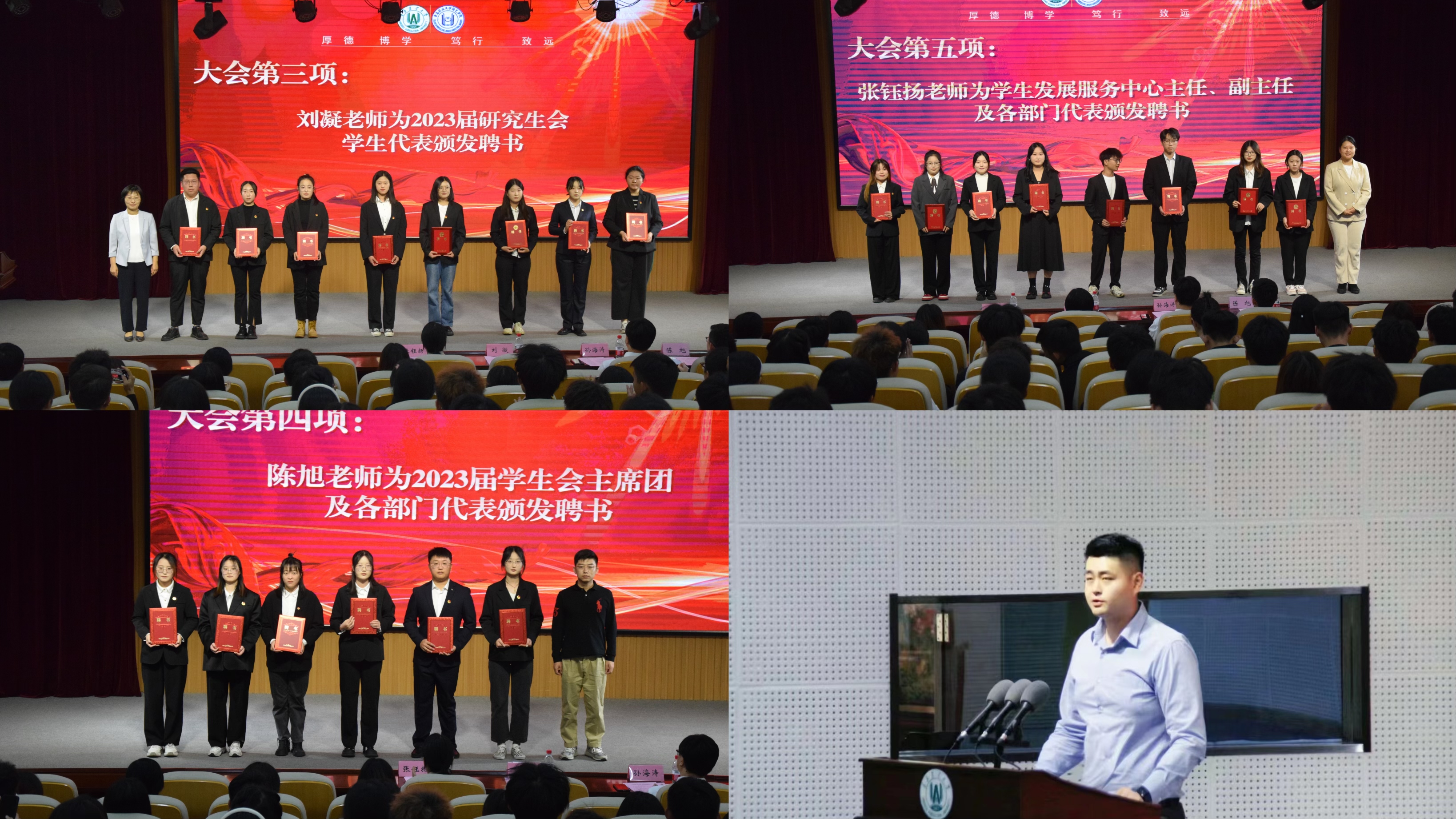 大会在庄严的国歌声中拉开帷幕。赵健宣读了2023届研究生会、学生会、学生发展服务中心成员名单。刘凝、陈旭、张钰扬分别为2023届研究生会、学生会、学生发展服务中心主要学生干部颁发聘书。