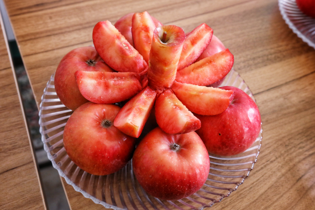 在大山果业会议室,与会代表品尝了‘福星’、‘福美’、‘福丽’、‘福九红’、‘黄金脆’和‘红丹’等品种,尤其对红肉苹果‘红丹’产生了浓厚的兴趣。