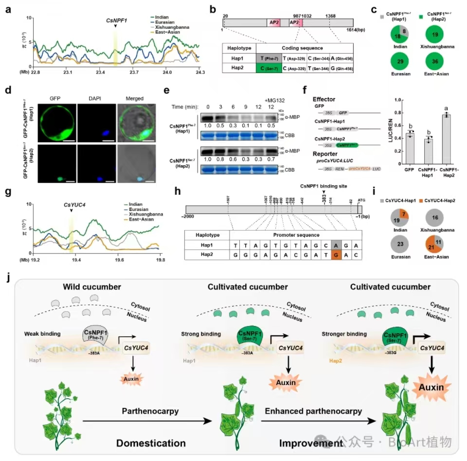 根据现有研究,黄瓜分为四个主要(地理)类群:印度、欧亚、东亚和中国西南部的西双版纳类群。其中,印度类群主要为野生黄瓜(Cucumis sativus var. hardwickii),与栽培黄瓜(Cucumis sativus var. sativus)相比,野生黄瓜具有小叶、强分枝能力、较弱的单性结实能力,以及苦涩不可食用的果实。此项研究通过比较三种栽培群体(欧亚、东亚和西双版纳)与野生群体(印度)的基因组区域,发现CsNPF1位点在驯化过程中受到强烈选择。而CsYUC4位点仅在东亚栽培种中受到选择(图3)。在驯化过程中,由于CsNPF1第7位氨基酸由苯丙氨酸(Phe)突变为丝氨酸(Ser),使得CsNPF1蛋白更稳定并增强了对下游基因的调控能力。此外,该研究还发现驯化过程中CsYUC4启动子区域的-383位碱基由A变为G,导致CsNPF1对CsYUC4的激活能力增强,从而提高了CsYUC4表达和生长素水平,进一步促进单性结实的形成(图3)。单倍型分析发现,CsNPF1优异单倍型Hap2(CsNPF1Ser7)和CsYUC4优异单倍型Hap2(CsYUC4-383G)与黄瓜果实生长素水平和单性结实增强的表型相关(图3)。 .jpg)